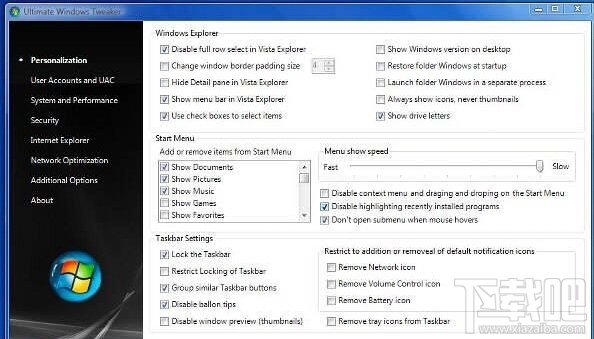 Ultimate Windows Tweaker是一款免费小巧的Vista系统优化工具,适用于32位和64位的Vista系统。只需轻点鼠标,就可以快速优化系统。 Ultimate Windows Tweaker包含了超过130项的优化,主要包括了以下几个方面: 1、个性化设置; 2、个人账户和UAC; 3、系统和显示设置; 4、安全设置; 5、IE浏览器(IE7/IE8); 6、网络优化; 7、其他设置。