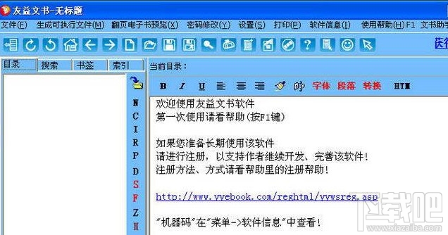 集成pdf阅读功能,不需要安装任何pdf阅读器,即可方便阅读pdf文件。 可方便制作翻页电子书。 能生成具有全文搜索、目录搜索、收藏夹等功能chm格式文件。 能生成便携设备如ipad,手机android系统等阅读的epub格式文件;对所管理的资料可直接生成可执行文件,在任何计算机上阅读该软件采用视窗风格,目录树结构管理,所见即所得的设计理念,不需要复杂的转换、编译。 使用,操作方便,可以自由地添加、删除目录树,可以随心所欲地编辑文档内容,改变字体大小和颜色。 该软件不断吸收了同类软件的优点,同时在功能及设计上又具有独特的创新性,采用混合索引算法,数据存储采用自带的压缩格式,独特具有多重文本超链接功能,对导入的网页仍可编辑,支持Word文档、网页、文本等多种格式文档之间的转换。采用了多级分布式加密算法,界面支持皮肤等个性化的设计。