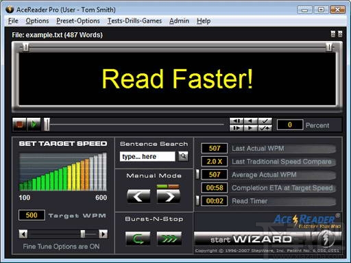 为改进你的阅读技巧,AceReader包含两种模式:眼扫描训练模式和中心文本模式。 在眼扫描训练模式中,文本从显示区域卷绕穿过,迫使你的眼睛象正常阅读那样移动。该软件可以作为一种教学工具来使用,通过设置在更高的速度档上的练习,可以使你不论在计算机上还是在书本上都能提高阅读速度。