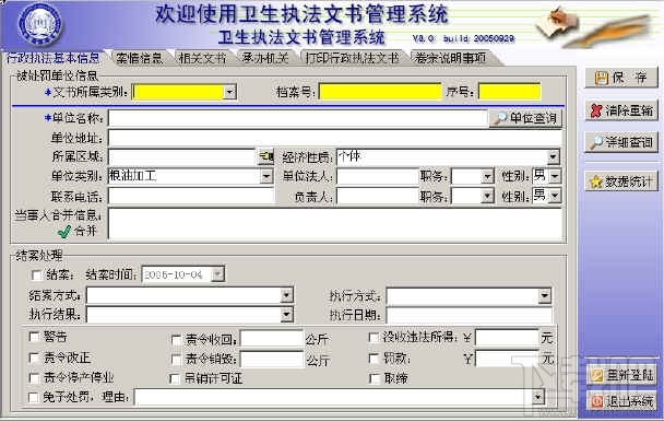 1、卫生行政执法文书管理系统是根据国家卫生部2003年5月1日开始实施的《卫生行政执法文书规范》的执法文书要求而设计的一套处理日常卫生监督、卫生执法工作的管理系统 。包含卫生监督意见书、职业禁忌人员调离通知书、卫生行政控制决定书、解除卫生行政控制通知书、封条、案件受理记录、立案报告、案件移送书、现场检查笔录、询问笔录、证据先行登记保存决定书、证据先行登记保存处理决定书、案件调查终结报告、合议记录、行政处罚事先告知书、陈述和申辩笔录、行政处罚听证告知书、行政处罚听证通知书、听证笔录、听证意见书、行政处罚决定书、当场行政处罚决定书、送达回执、强制执行申请书、结案报告、产品样品采样记录、非产品样品采样记录、产品样品确认通知书、产品样品确认书、技术鉴定委托书、检验结果告知书、行政答辩状、行政上诉状、行政申诉状、调查笔录、行政处罚陈述申辩告知书、重大案件领导讨论记录、责令改正通知书、行政处罚审批表、证据先行登记保存审批表、没收物品处置单、物品清单、案件处理审批表、调取证据清单、建设项目设计卫生审查认可书、建设项目竣工卫生验收认可书、其他相关证明、卫生行政许可申请材料接收凭证、卫生行政许可申请材料补正通知书、卫生行政许可延期通知书、卫生行政许可申请受理通知书、卫生行政许可申请不予受理通知书、卫生行政许可听证告知书、卫生行政许可听证通知书、不予卫生行政许可决定书、不予延续变更卫生行政许可决定书、撤消卫生行政许可决定书、注销卫生行政许可决定书。