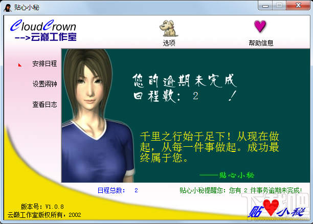 拥有电脑,使用本软件,就拥有一位贴心小秘!您是否经常将日程安排密密麻麻地写在纸上?您是否经常有逾期未完成的事而贻误商机?您是否对千头万绪日程事务的轻重缓急茫然无知?你是否需要保存几年来的所有事务日志?您是否还需要一个个性化的闹钟?贴心小秘都能帮您轻松搞定。贴心小秘,爽心界面、贴心功能、舒心感受。