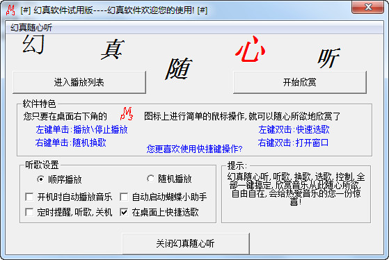 您是否想在电脑桌旁工作时,只用鼠标轻轻一点,耳边便飘荡起美妙动听的MP3音乐?您是否想用最简单的方式来换歌、选歌、播放停止?幻真MP3会给热爱音乐的您一份惊喜。更逼真的音效、更完善的功能、更简单的操作,让您沉浸在音乐的海洋里