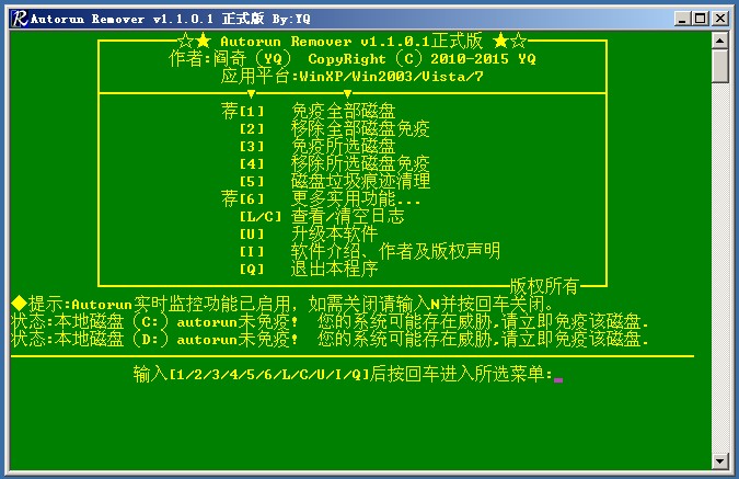 Autorun Remover(Autorun专杀工具)特别针对依赖Autorun.inf文件传播的病毒、木马等危害计算机健康的恶意程序编写而成,旨在对Autorun.inf文件进行免疫,阻断其传播途径,以达到防治上述恶意程序的目的。