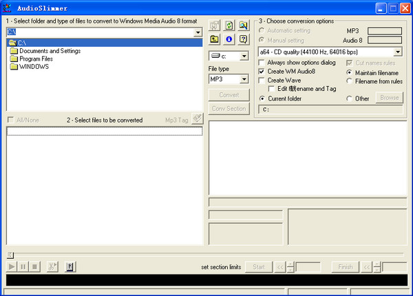 Audio Slimmer是一个容易使用的音频转换工具。Audio Slimmer可以将MP3或WAV格式转换为新的Windows Media Audio8格式。可以转换Mp3为WAV,可以播放音乐和管理音乐文件。可以转换多个文件,可以提取音频文件的某部分。拥有高级的ID3Tag编辑器,可以对MP3和WMA文件进行处理