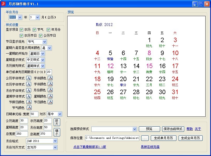 月历制作助手可以自动生成透明月历图片,把生成的图片文件用photoshop等图像处理软件进行加工可以极大地提高制作月历的速度,无论你是要做月历壁纸还是挂历、台历,月历制作助手都可以助你一臂之力,提高效率。通过月历制作助手制作月历,可以自由选择是否需要农历、节气、节日等,可以设置字体、颜色、字号、尺寸等,并且有星期、横、竖三种排列样式。生成png透明图片方便二次加工。