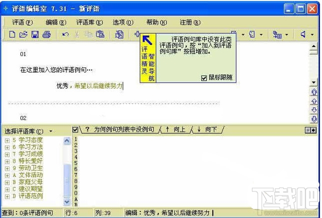 5、提供多个典型的评语范例,只需轻轻点击鼠标即可直接套用。还可以自己增加、修改、删除典型评语范例;