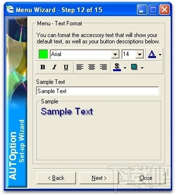 现在,编译你的菜单到一个EXE! AUTOption现在比以往任何时候都更强大,使用起来更加得心应手。一个菜单向导让你的菜单和快捷地完成工作,一个菜单编辑器,让您可以在一个交互式环境中编辑你的菜单,以及获得更先进的功能,并编译您的菜单系统到一个EXE的能力。通过利用过自己的背景图像标准的Windows按钮,AUTOption允许您创建专业,交互式自动运行菜单系统。有了广泛的适用于你的按钮操作和向导填写你的命令你,你可以迅速拥有一个菜单程序,它会打动你和你的用户的一致好评。 AUTOption运动15风格按钮位置的动画,最小化和出口控制,当用户在按钮位置的鼠标,其显示的文本的formattable文本区域,和高达单个菜单上廿个按钮(与尽可能多的子菜单作为你希望)。
