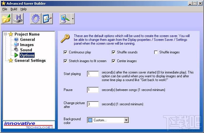 Advanced Saver Builder可以将您的图片制作成屏幕保护程序,生成.scr文件或EXE安装文件,EXE安装文件可以将您所制作的屏幕保护程序安装到其它计算机。