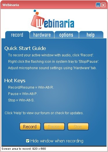 Webinaria是一个开源的屏幕截取软件,它可以记录整个屏幕的视频和音频,使用快捷键或程序按钮,自己选择截取窗口或全屏录制。[Webinaria软件程序的设计简单易用,举例来说在安装后只要点击一个鼠标按键,就可以启动程序的屏幕捕捉。该软件配备几个选项的可以变化和调整某些方面的画面捕捉,例如在同一时刻记录音频对话(连接麦克风)和网络视频(连接摄像头),Webinaria屏幕捕捉软件会自动将这些添加进去。