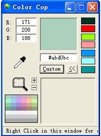 ColorCop包含多种功能特性,具有取色器、放大镜(含有多个放大级别)、不同点阵的采样(单像素以及3乘3、5乘5取样)、抓取为网页安全色、颜色历史记录和一个辅助的调色板。同时,Color Cop 也可以将 RGB 十进制转换为十六进制颜色代码。