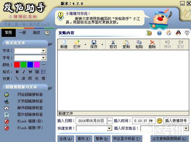 特点:(1)超越系统自带记事本的编辑功能。如:英文大小写之间的转换、阿拉伯数字与中文数字间的转换、内码转换、删除空白行、首行缩进……(注:基本的打开,复制粘贴,撤销功能被放置在工具栏里,其他高级功能放在文本框的右键中。在对文本进行时一般都分两种情况,如果你没有选择文本,那么你运行的命令是针对整个文档而言的,如果你有选择文本,那么你运行的命令就是针对你所选文本的,这点要注意。)(2)完美撤销、重做功能。可实现无限撤销,除非你新建文件或打开新文件。(3)方便的拖放功能。可从其他地方拖动文字到发贴助手的文字编辑区中。(4)选择文本后可用鼠标拖动执行类似剪切的功能,拖动的同时安住Ctrl键则为复制。(5)及强的LB5000XP标签编辑功能,现在再也不要你手动输入又长又难记的标签了,你只需选择相应功能的按钮即可轻松搞定。由于标签的编辑变的如此简单,你大可花点时间来修饰你的帖子,让别人看看你个性化的帖子吧。(6)标签突出显示功能。当标签越来越都是可能会和文本混在一起难以分辨,以至于在修改标签时会出现一些小错误,如你在编辑文字时不小心把某个标签的括号删除了。现在好了,你只要突出显示一下就很容易找出错误来,看的也舒服。(7)功能强大的查找替换功能,能帮你快速定位和替换文字。(8)文件信息显示功能能计算出你的贴子里有多少英文字母,汉字,数字等信息。(9)可自定义文本编辑区的文字字体,文字颜色,背景颜色等。(10)可以方便的在文章中插入表情符号。(11)可以方便的在文章中插入时间、日期。(12)可以快速插入你好友的名字,点击好友列表框里的设置好友可方便的添加删除好友。(13)可快速插入一段要发表的内容,该内容可在快速发表列表框里选择设置发表来方便的添加删除发表的内容。在快速发表编辑框中你可以输入#1和#2来表示两个对象。#1和#1说代表的内容可在旁边的列表框中选择,也可自行输入。