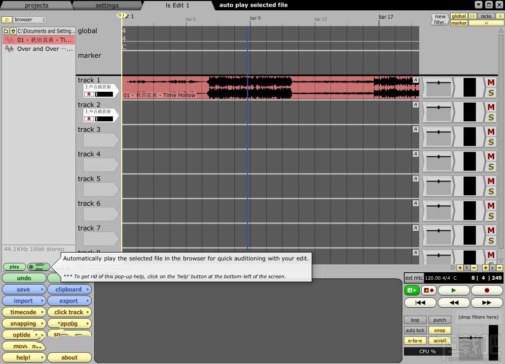主要功能:--支持无限多个VST插件--独特的track-freezing功能可以在你的电脑无法实时处理音频时提供给你方便--无限UNDO/REDO--内置混响,4段均衡器,延迟,合唱,相位,压缩,低通滤波,音高变化效果--完整的MIDI音序器,有钢琴卷帘窗,支持步进录音和loop--完整的多轨音频功能,并且有时间伸缩功能--支持DirectSound和多通道ASIO--支持ReWire
