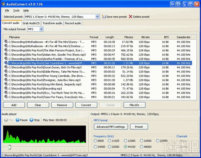 AudioConvert可以抓取CD音轨转换出WAV、MP3、WMA、RAW文件,可以播放WAV、MP3、WMA、GSM、G.726、RAW、VOX、ACM、ADPCM、Ogg Vorbis、DSP文件,录制 MP3、WAV、VOX、RAW、G.726文件,支持 cdplayer.ini、读/写 MP3 卷标,内建混音装置、均衡器。