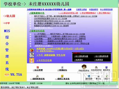 幼儿园MIS综合管理系统是益智儿童网站推荐+幼儿园课件FLASH网站推荐,幼儿园软件专业网全力推荐!三套系统(3合1),根据客户要求,新增更多实用功能,并加强操作的方便性。学生的考勤请假数据与收费系统相结合,可根据考勤数据自动对保教费、伙食费等等项目进行每月的扣费统计,并可设置多种扣费方案☆幼儿园MIS综合管理系统V8A,至今最实用的幼儿园MIS管理系统,用户众多、功能全面、方便实用、操作简便!