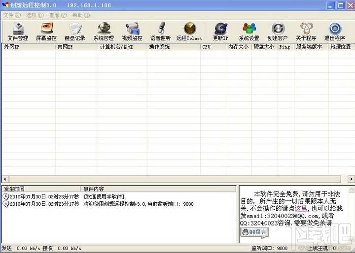 创想远程控制是一款的远程办公、远程电脑控制、远程视频控制软件,方便个人和企业用户远程对电脑实现管理,目前实现的功能有文件管理,屏幕监视,键盘记录,远程终端,进程管理,窗口管理,视频监控,监控远程摄像头,语音监控。