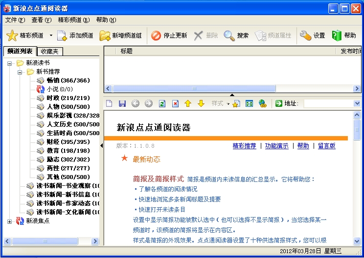 新浪点点通阅读器一款全新的快捷实用的阅读软件,我们可以把它看作一个信息传递通道,也可以把它当成一个资讯平台。通过它我们可以获取、阅读和管理XML格式的信息,它一方面继承发扬了新闻聚合技术的传统,另一方面在总结经验的基础上进一步改进完善了RSS阅读器,相信它不仅仅会推动新浪点点通自身的发展提高,也将促进RSS的传播推广。
