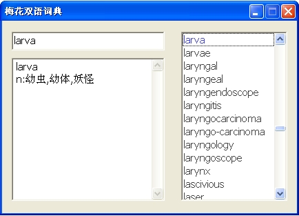 梅花双语词典是这样一款词典:绿色,简单,快速不占用资源。相对于金山、巴比伦、灵格斯等著名词典软件(超海量的词库和强大的功能),梅花双语词典功能很少,但也许不是每个人都需要那么多功能,大多数时候也许只需要英汉单词对照就可以了。梅花双语词典可以随系统启动,平时只占用1M左右的内存,确可以随时为您提供16万条英汉词汇翻译。