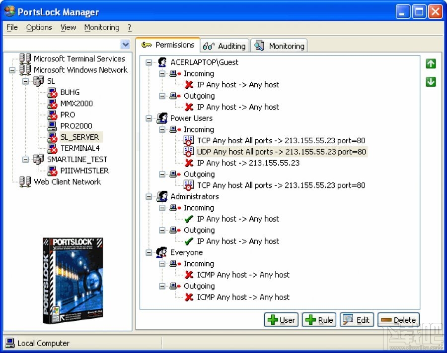 portslock是一款用户级访问控制的Windows NT/2000/XP防火墙。一旦安装portslock防火墙软件,管理员能直接分配权限给TCP/IP连接,和管理一个硬盘NTFS分区的权限类似。它可以让你控制哪些用户可以访问哪些基于TCP / IP协议(HTTP、FTP、SMTP、POP3、Telnet等)在本地计算机上,可以位于一天或者一周时间。你也可以设置允许或拒绝的TCP / UDP端口和IP地址的传入和传出连接。