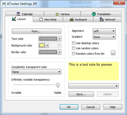 ATnotes是一款桌面便笺工具。除了基本的记事功能外,ATnotes还具备有以下特殊功能:便条纸的颜色、尺寸、边框都可设定调整,并可在桌面上四处「贴」。可以自行设定文字的字体、颜色及大小,而且内容若包含有URL或邮件位址,还可直接透过关连软件进行连结或开启。单一或重复的闹铃提醒及逾期通知功能。便条纸具有缩小化及隐藏功能,缩小化只会显示第一行标题文字。提供有便条纸管理介面(Note List),可以让你浏览目前摆在桌面以及隐藏起来的所有便条纸。强大的字串搜寻功能可以帮你找出特定的备忘内容。完整的打印功能。多组的热键功能可以让你更方便随手即写即贴。