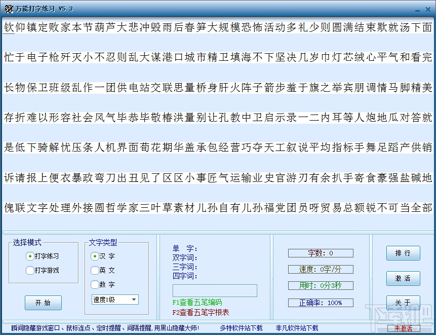 2、软件包含打字练习与打字游戏两大部分。打字练习提供汉字单字及词组练习、英文单词练习、数字练习,采用随机方式提取字库中的单字与词组进行组合,提供实时帮助,遇到不会打的字,按一下F1就会显示当前字及当前词的五笔编码。