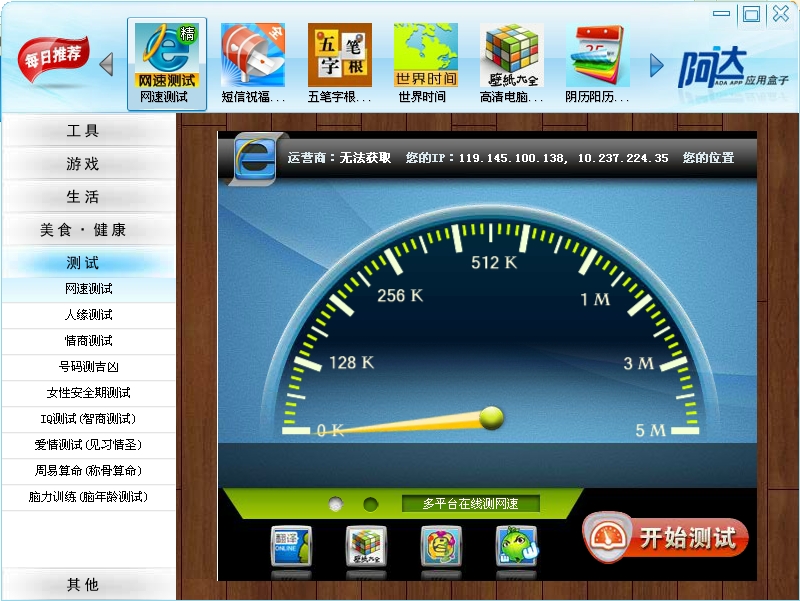 阿达应用盒子是一款专业在线网速测试工具,通过校验电信,网通,铁通3大网络运营商与您计算机之间的连接速度,给出相应的下载数据。能够比较准确真实的反映出用户当前的网络状况。