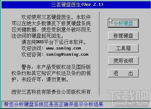 三茗硬盘医生是一款全免费中文国产硬盘事后修复工具,大小只有十几KB,支持非标准硬盘参数的硬盘,比Disk Genius功能还要强大。它能帮助我们修复主引导记录、系统引导 记录、FAT分区表等系统区数据,使受到意外破坏而无法访问的硬盘起死回生,此外还具有系统区数据的备份和查看、硬盘分析等功能。把他放在启动盘中,以后就再也不用害怕硬盘分区表的损坏了。