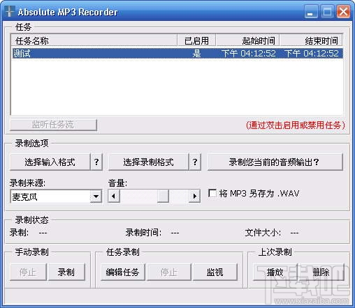 Absolute MP3 Recorder 是一款绝对超值的录音软件。就和它的名字一样,它可以把任何音源传来的信号录制为MP3文件,而且可以进行音质选择。同时,它可以直接截取Media Player信号,甚至连一些有版权的Realplay网络广播信号也照录不误。利用它提供的定时录音功能,它还可以在无人职守的情况下自动录音。最后,更可贵的是,它不需要注册,没有广告条的打扰,是一款确对免费的软件。