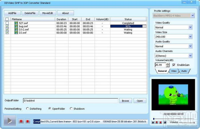 DDVideo SWF to 3GP Converter Standard是一个功能强大的SWF到3GP转换工具。转换SWF文件到3GP、3G2(3GPP/3GPP2)、MP4(黑莓、Gphone、索尼爱立信手机、诺基亚、摩托罗拉、三星、LG)、AVI、MPEG、DivX、Xvid等等。
