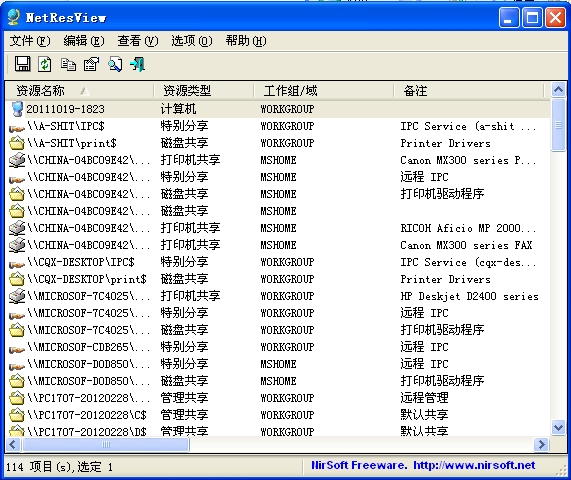 NetResView是一个用来显示连接到您的电脑的所有网络资源(计算机,硬盘共享和打印机共享列表)的小工具。NetResView局域网查看工具相对于Windows的“网上邻居”,NetResView 可以显示在一个域/工作组所有的网络资源,包括管理/隐藏的共享。NetResView不需要安装任何其它 程序或其他DLL。当你开始使用它,只需要复制它的可执行文件(NetResView.exe)到你喜欢的任何文件夹,并运行它。当您运行NetResView实用程序,它扫描你的局域网的所有计算机,并显示所有的计算机和网络共享列表。