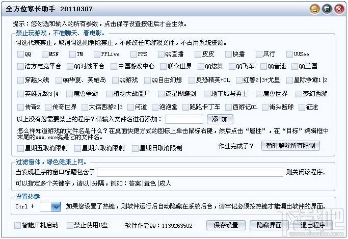 全方位家长助手具可禁止使用指定程序(如QQ、MSN、网页、游戏等);隐藏界面,开机启动等。
