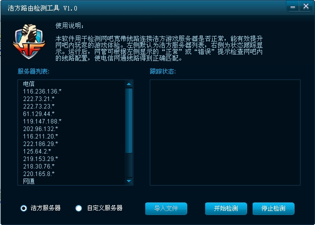 浩方路由检测工具是提供给电信网通双线网络环境(如网吧)的网络管理人员使用,用来检测网络连接到浩方服务器的路由配置是否正确。同时也提供了检测用户自定义ip列表的功能,所以也可以作为双线网络环境下路由配置的辅助检测工具。