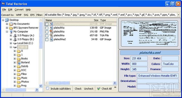 Total Vectorize converts是一款功能强大的图像转换工具,它可以转换所有主流的光栅图像格式 (TIFF, PNG, JPEG, BMP) 为WMF, EPS or SVG格式。