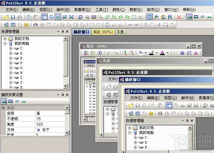 FullShot Enterprise一款屏幕抓图软件。 主要功能: 提供了多种抓图方式:除了抓取屏幕、抓取指定窗口、它还可以抓取自定义区域屏幕,可手动抓图、也可以取得鼠标指针、抓取按钮和命令栏、抓取长文档等方式; 可定义抓图快捷键; 支持多种色彩模式抓图,图象分辨率可到1600x1200,也可对所抓到的图象进行编辑转换; 支持多个显示器,可以抓取指定显示器中的屏显; 可对图象添加注释; 自动或手动打印任何尺寸的图像,可将多幅图像打印在同一页上; 支持多种图像格式BMP, CUR, DIB, EPS, GIF, ICO, JPG, PCD, PCT, PCX, PNG, PSD, RAS, RLE, TGA, TIF, WMF and WPG; 图象编辑功能:图像加边、改变图像尺寸、反面或旋转图像、图像的灰度或黑白转化、合并两张或多张图像到一张、剪切图像及缩减图像色彩等; 可编写、保存及打印图像注解; 图像资料管理,它方便地管理你收藏的图片。