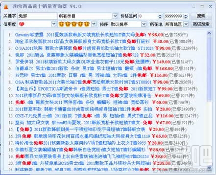 本版增加了按排序、信用度、所在地、价格区间查询方式。 软件可以搜索淘宝网的一些热门商品,与前几版不同的是,本版可以搜索前40条商品信息。除此之外还可以按高级搜索,高级搜索的商品更加全面。