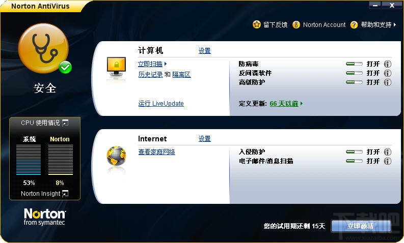 Norton AntiVirus 是一套强而有力的防毒软件,它可帮你侦测上万种已知和未知的病毒,并且每当开机时,自动防护便会常驻在System Tray,当你从磁盘、网路上、E-mail 夹档中开启档案时便会自动侦测档案的安全性,若档案内含病毒,便会立即警告,并作适当的处理。另外它还附有「LiveUpdate」的功能,可帮你自动连上 Symantec 的 FTP Server 下载新的病毒码,於下载完后自动完成安装更新的动作。 新特性: 检测删除病毒和恶意软件。 自动屏蔽恶意软件和蠕虫。 防止邮件中的病毒。 寻找移除隐藏的漏洞。 自动更新功能。 即时保护功能。 系统要求:至少Windows XP以上。 目前支持Vista兼容模式。更多关于Vista的信息请参见这里。 注:试用版在购买之前,只能试用15天。