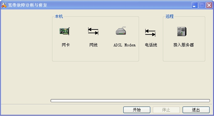 宽带故障诊断与修复工具是一款免费、绿色、小巧、实用的宽带故障诊断、修复软件。其功能灰常的单一,就是用于个人宽带故障快速检测与修复。可以检测连接网络的一切设备故障,如:网卡,网线,adsl mmodem,电话线以及与远程服务器的连接!故障检测比较明晰!