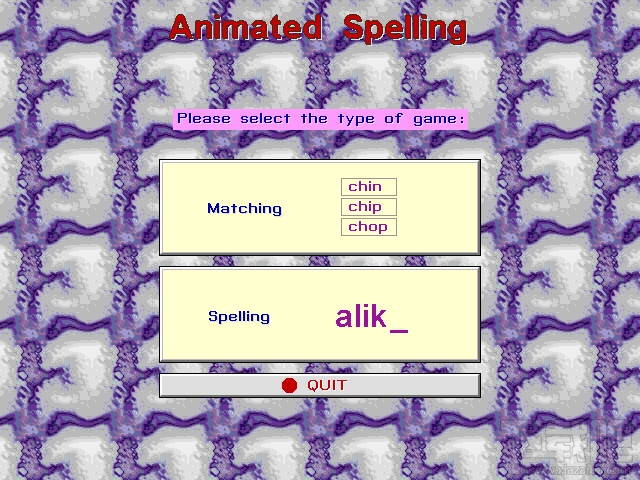 Animated Spelling-Animated学习系列软件之一。用听写的方式学习英文单词,全程语音,外加过关后奖给你可爱的动画。共两种方式,第一种是听读音,从给出的4个单词选出一个正确的;第二种是听读音,输入正确的单词。每种都有初级和高级两种难度选择。都答对一个,下面的方框内就会出现一个图片牌,直到全部大队,就会进入动画欣赏。操作简单,喇叭是用来听读音的,可以反复听。单词比较简单,适应刚刚学习英语不久的儿童。