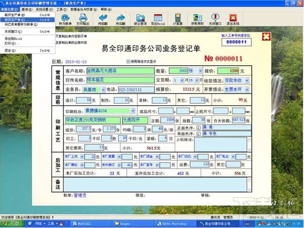 更新日期:2013-1-26,新版本:v2.5.98 ※。 将“修改生产单”与“转为新单”的权限分开管理; ※。 为纸张管理增加了自定义纸张尺寸,用户可在“自定义工艺名称管理”中添加所需的纸规格尺寸。 易全印通印刷管理系统集先进的信息技术与完善的管理思想于一体,整合了印刷企业优秀管理理念,优化企业供应链资源,改善企业业务流程,减少企业的人工支出成本,为企业进行生产管理和决策提供有力的依据,帮助企业在优秀的时间,优秀的位置,运用优秀的管理方法和现有资源,实现企业比较大利润,提高企业核心竞争力。 易全印通印刷管理系统适合中小印刷企业使用,并针对中小印刷企业的人员配备特点对操作界面进行了优化,开具生产单的界面如同您以前手工开单一样,直观、通俗易懂。强大的统计查询功能让您可以随心所欲的查询任意时间段、任意客户、任意业务员的所有或部分业务,并可将结果导出至Excel表格。 易全印通印刷管理系统使用方便,操作简单,初次使用时在系统设置中设置好相关常用数据后,以后在全程操作中几乎不需要输入汉字,只需用鼠标指指点点即可完成操作,免去您输入汉字的烦恼; 数据库安装在本地电脑,系统自动每天备份,安全稳定。