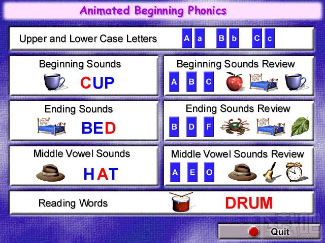 Animated 系列软件之一。学习英文字母及简单的适合儿童生活环境的单词的绝佳软件。动画学发音,生动形象的发音教程,适用范围广。超过200张3D图片与音乐,帮助孩子们辩识与读音。操作比较简单,全程语音提示,不过全是英语罢了。共分8种学习功能:最上边“upper and lower Case Letters”为学习26个字母,可以辨别每个字母的大小写;“CUP”、“BED”、“HAT”三个部分学习方法是一样的,都是从给出的卡片中选出一个包含给出的字母(在最上边的红字母)的卡片,只不过给出的字母的位置不一样,分别是第1个、最后一个、中间一个。点击喇叭可以听到卡片所示的物体的标准发音。中间右边“ABC、BDF、AEO”三个部分,与以上是一样的,不过给出的字母排在了右边,一般先点击字母,再在卡片中找出包含该字母的单词。最后一部分DRUM则是直接给出一个单词,在选择性相应的卡片。每一学习部分包括10道题,全部答对后可以进入游戏画面,共2种,分别与Animated Puzzles Shareware和ANIMATED MEMORY GAME差不多。