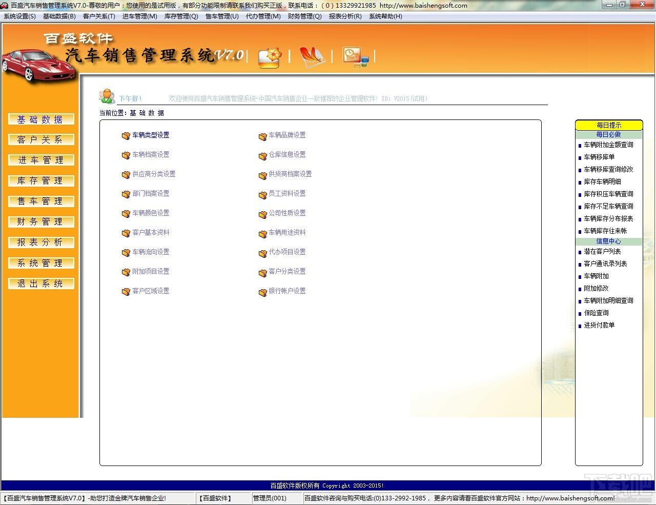 智百盛汽车销售管理系统是一款能提高汽车3S店、4S店、汽车贸易公司的管理效率,减少企业管理成本的信息化管理软件。经过12年的市场需求调研以及数百家行业客户的反馈意见,并参考了大量汽车服务行业的先进管理经验形成了现在的智百盛汽车销售管理系统。