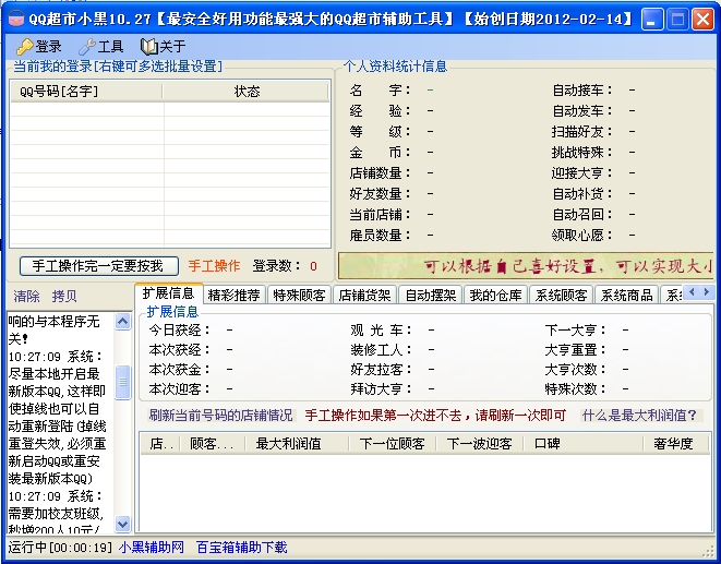 3.25 MB/2020-08-17QQ超市小黑(QQ超市辅助器)功能介绍:1.自动完美迎客2.自动迎客大亨.3.自动补货.4.自动升级货架可以设置升级顺序和升级范围.5.自动购买货物6.自动访问好友获得客人7.自动扫描好友垃圾.8.自动运行和接待巴士.9.自动挑战特殊顾客.