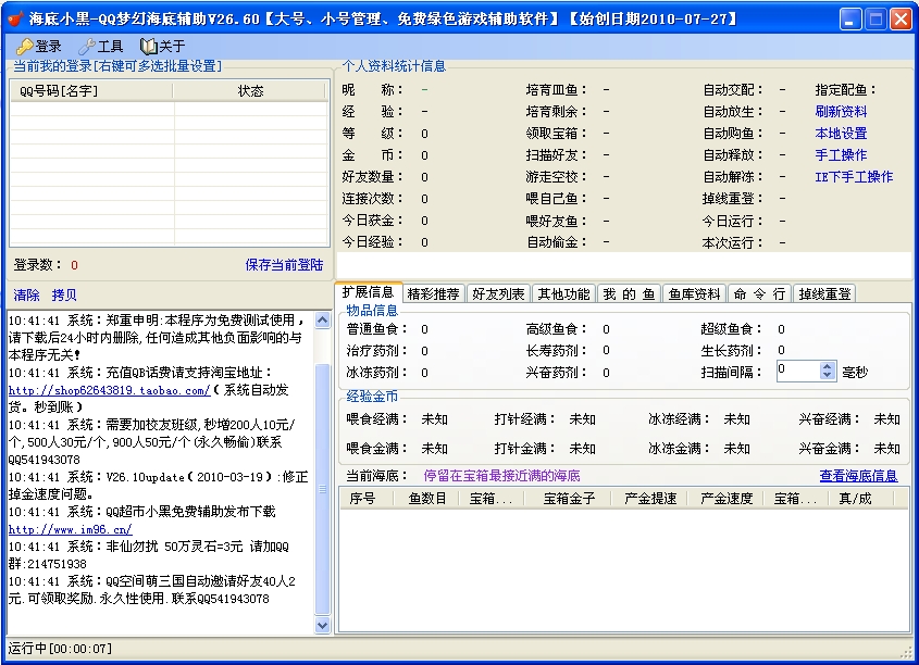 3.83 MB/2020-08-17QQ海底小黑(QQ梦幻海底辅助器)功能:1.自动收取好友的金币.2.可设置帮好友喂鱼.3.可设置放逐鱼获得金币.4.可设置给鱼使用冰冻或兴奋药剂.5.可设置自動配種获得经验奖励.6.支持提高养鱼数量.7.可以扩充宝箱的容量.