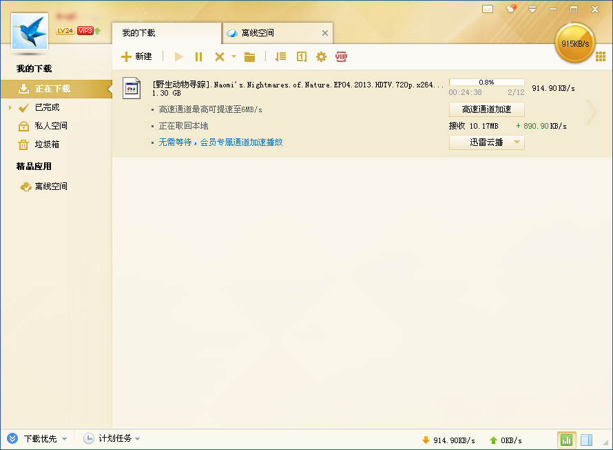 迅雷vip尊享版是专为迅雷白金会员设计的迅雷会员客户端,还原迅雷最快、最小的特性。迅雷vip尊享版是迅雷正在打造一款白金会员专属的迅雷会员尊享版,轻快是迅雷会员版比较大的特点,从技术上兼顾了冷门资源的快速下载、缩短软件开启响应时间,以及开启后的资源占用。