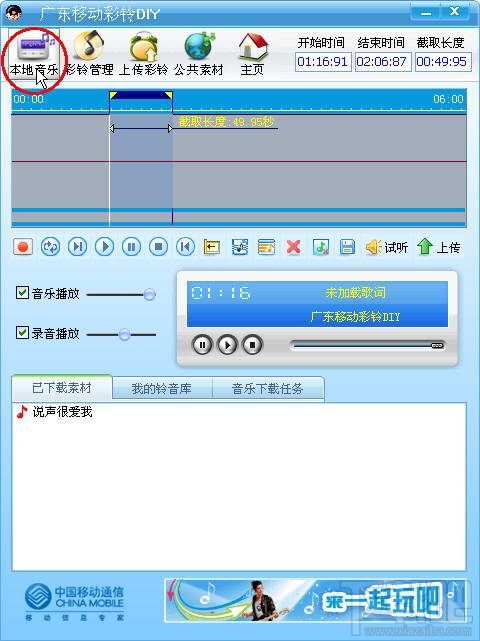 彩铃DIY是一款融歌曲搜索,在线播放,音频转换,音频编辑,制作彩铃的音频娱乐软件。它是专门为广东移动用户量身定制开发的一款彩铃DIY编辑软件,可以从流行的音乐格式(目前支持格式有 MP3 、WAV 、WMA 、AVI 、ASF 和OGG 格式)转换成彩铃格式,并支持用户从素材中选择一段音频来制作彩铃,也可以自己录音或者混音来制作彩铃,让用户可以拥有属于自己独特的彩铃,实现用户对彩铃个性化需求。