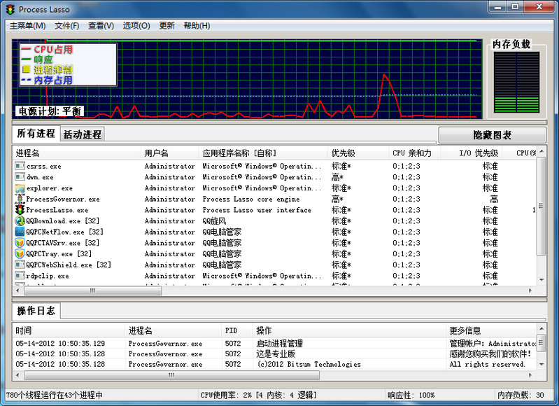 Process Lasso是一款独特的调试进程级别的系统优化工具,Process Lasso主要功能是动态调整各个进程的优先级并设为合理的优先级以实现为系统减负的目的,可有效避免蓝屏、假死、进程停止响应、进程占用 CPU 时间过多等症状。同时Process Lasso还具备前台进程推进、工作集修整、进程黑名单等附加特性。Process Lasso 对系统的优化是完全实时加智能的,不会修改任何系统既有配置,适用于普通家庭用户和专业工作环境。
