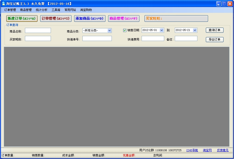 淘宝记帐王为淘宝卖家设计的记账软件,简单易用,具有订单添加、修改、删除、查询、库存的功能,而且可以按商品分类添加商品,便于管理和查找。