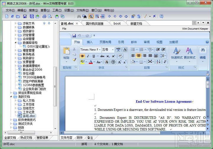 Wim文档管理专家--专家级的文档管理工具--帮您轻轻松松管理所有文档资料。 电脑用多了,上网多了,您的电脑中是不是有很多有价值的文档?但是当您发现有一天需要这些文档时,它们却不知道跑到哪里去了,您是不是有这种痛苦的经历?Wim文档管理专家可以帮你彻底消除这些烦恼! Wim文档管理专家作为个人文档管理必备工具,她可以帮助您轻松管理所有的文档。她支持Word、Excel、Powerpoint、PDF、Html、Rtf、Txt、Mht等格式,甚至是任意格式文档,界面直观,极易上手。 主要特点: 1、文档管理操作方式与Windows资源管理器相似,文档管理非常方便,极易上手。 2、多文档库、多文档界面,文档阅读、管理更加方便快捷。 3、嵌入式Office编辑器,编辑Office文档轻松快捷。 4、内置强大的富文本编辑器,并支持外部编辑器,文档编辑更加方便快捷。 5、内置支持25种语法高亮的文本编辑器。 6、内置网页浏览器,轻松浏览、快速保存网页。可以快速抓取网页中的图片、文本,甚至Flash文件。 7、强大的文件管理器,支持本地磁盘文件(不导入数据库)管理。并可以为这些文件增加附件、备注等信息。 8、强大的附件、备注管理功能。全面支持各种类型文档管理,甚至支持文档快捷方式的管理。 9、内置强大的搜索功能,支持全文检索。 10、强大的文件、文件夹导入支持。 11、支持剪贴板监视功能,可直接从剪贴板获取文档。 12、悬浮窗支持拖放文档、文本和HTML,并自动生成文档。 13、强大的插件功能;内置屏幕捕捉插件,轻松抓取屏幕图片;内置各种文本处理插件,如简繁体转换等,文本处理更加轻松、快捷。 14、支持数据库安全管理和压缩模式,文档管理更加安全、高效。 15、高效率的动态文档库加载技术。