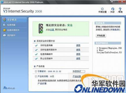 安博士V3 Internet Security 2009为安博士防病毒单机版产品,可应用于Windows 98/ 2000 Professional/XP/Vista系统,不仅可以对病毒及间谍软件进行扫描和治疗,还可以有效拦截黑客的入侵,并阻断个人信息的泄漏,为用户计算机和个人信息的安全提供全面保护。安博士是全球最早(1988年)独立研究计算机防病毒技术的企业之一,也是亚洲比较大的综合安全解决方案与服务提供商之一,在市场占有率高达72%,是全球防病毒市场的十大品牌之一。V3防病毒系列产品10次获得CheckMark和10次通过VB100%国际权威认证。 V3 IS 2009是安博士公司综合其20年计算机反病毒和信息安全产品设计经验,针对个人客户推出的新一代全面信息安全解决方案。 V3 Internet Security 2009 提供了5大模块,全面保护您的网络安全:1、 V3杀毒软件2、 反间谍软件3、 个人防火墙4、 个人信息保护模块5、 邮件保护模块主要功能:病毒的扫描及治疗- 查找并治疗病毒、蠕虫等恶意代码。利用病毒实时监控功能,还可以预防计算机被病毒感染。- 切断通过互联网入侵用户电脑的攻击包,保护个人电脑不受网络攻击。恶意程序的扫描及治疗- 查找并治疗在用户不知情的情况下安装的、有可能泄露用户个人信息或显示广告窗口的间谍软件。利用间谍软件实时监控功能,还可以预防间谍软件被安装到计算机中。- 完全清除Cookie、临时互联网文件、地址栏访问记录等生成的各种文件,通过最理想的的内存优化,维持优秀系统性能。拦截黑客攻击- 阻止那些没有获得用户许可的应用程序连接到互联网而泄漏用户信息,并拦截未得到许可的用户通过网络访问计算机。利用拦截网络入侵功能,可以有效检测并拦截攻击企图。- 根据互联网及网络连接,共享文件夹规则设置拦截连接到系统的非法连接,根据Home、Office等用户系统的使用环境应用优秀的网络策略。保护个人信息- 防止个人信息通过Phishing邮件或Phishing网站以及即时通信软件发生泄漏。利用网站过滤功能,可以拦截指向有害网站的访问。- 文件加密功能可以对重要的文件或文件夹进行加密,有6种加密算法可供用户选择。文件粉碎功能可以彻底删除重要文件