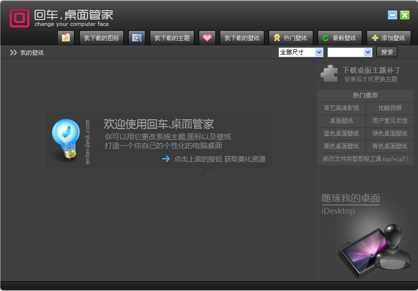 回车桌面管家提供winxp,win7电脑主题切换,海量壁纸下载,并可定时设置壁纸,以及桌面图标隐藏功能。实时隐藏(显示)桌面图标功能,让你的桌面干干净净,保护你的个人隐私,除提供平铺,拉伸,居中的设置壁纸模式,更首创自动设置壁纸功能,任何照片图片都可以设置为最合适的桌面壁纸,可水平或者垂直翻转壁纸,可设置每天电脑启动,随机自动更换你选择的壁纸。