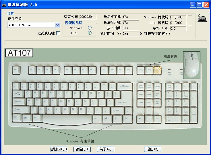 KeyChecker键盘检测器介绍:轻易地检查出键盘上所有按键能否正常工作,为我们在选购键盘提供了极大的方便。运行键盘检测器后,直接弹出如同键盘平面图的主界面。当我们按下键盘上的任意一键时,界面上即时显示出是否正常(若呈现绿色网状提示,代表该键正常)。如果我们按下鼠标左键、右键、中央滚轮,在主界面右上角的“鼠标提示区”也会即时显示。另外,点击“检测LED”按钮后,可以检查键盘上的LED指示灯能否正常显示(按下该按钮后,所有指示灯均闪烁,再次按下该键后停止)。